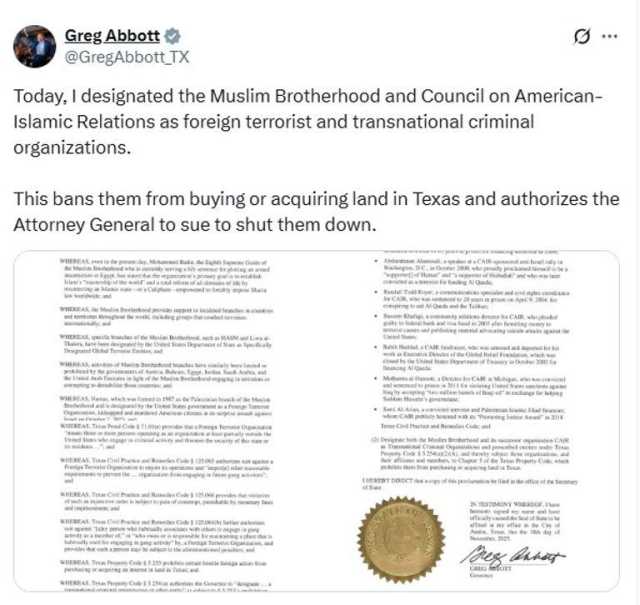 أعلن حاكم ولاية تكساس الأمريكية، الجمهوري غريغ أبوت، تصنيف كلٍّ من جماعة الإخوان ومجلس العلاقات الأمريكية الإسلامية (كير) كـ"منظمات إرهابية أجنبية" و"منظمات إجرامية عابرة للحدود".