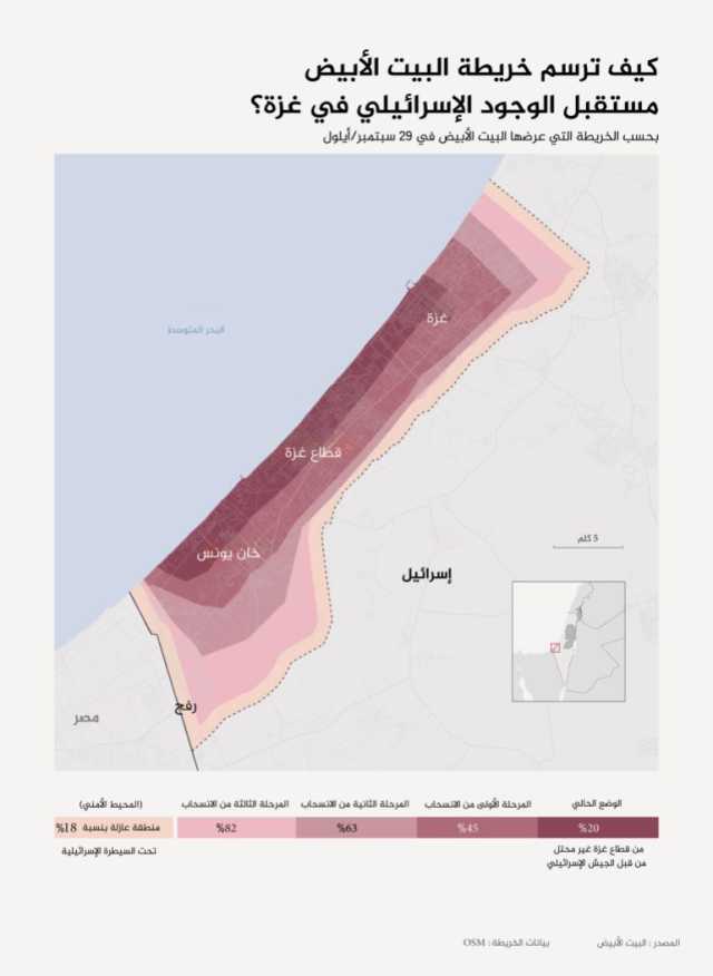 وتُظهر الخريطة، التي نُشرت بالتزامن مع طرح الخطة في 29 سبتمبر/أيلول الماضي، تقسيم القطاع إلى نطاقات لونية تمثل نسبة المناطق غير الخاضعة للوجود العسكري الإسرائيلي حاليا، والمناطق التي يُفترض أن تنسحب منها القوات وفق 3 مراحل متتابعة.