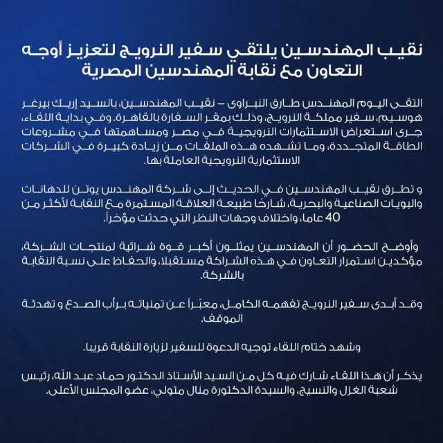 نقيب المهندسين يبحث مع سفير النرويج أزمة يوتن مصر