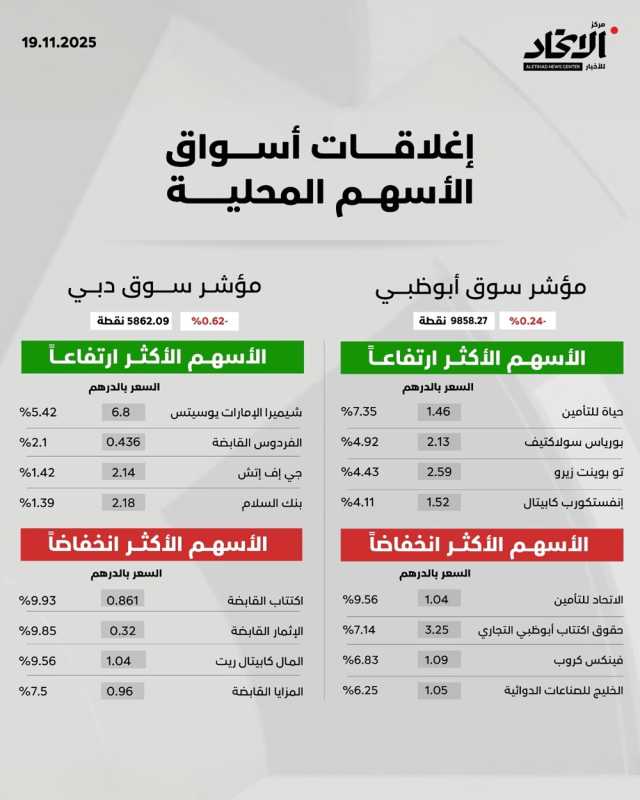 وتضمّنت قائمة الأسهم النشطة المرتفعة «توبوينت زيرو» بنسبة 4.43% إلى 2.59 درهم، «أدنوك للإمداد» بنسبة 0.54% ليغلق عند 5.57 درهم، و«العالمية القابضة» بنسبة 0.07% ليغلق عند 400 درهم،. وفي المقابل تضمنت قائمة الأسهم النشطة المنخفضة «أدنوك للغاز» بنسبة 0.59% ليسجل 3.34 درهم، و«منازل» بنسبة 1.53% إلى 0.32 درهم. و«بنك أبوظبي التجاري» بنسبة 1% إلى 13.7 درهم، و«مصرف أبوظبي الإسلامي» بنسبة 1.5%، وأيضاً «بنك أبوظبي الأول» بنسبة 1.2% إلى 16.62 درهم.