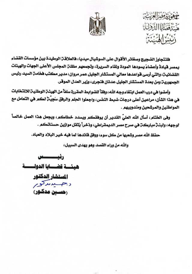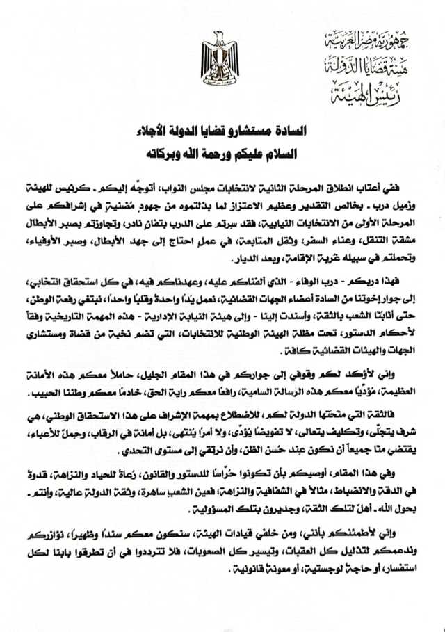 وتضمن بيان هيئة قضايا الدولة أنه مع انطلاق المرحلة الثانية من انتخابات مجلس النواب، يسعدني – بصفتي رئيسًا للهيئة وزميل درب – أن أعبّر لكم عن خالص التقدير وعظيم الاعتزاز بما بذلتموه من جهود مضنية خلال إشرافكم على المرحلة الأولى من الاستحقاق الانتخابي.