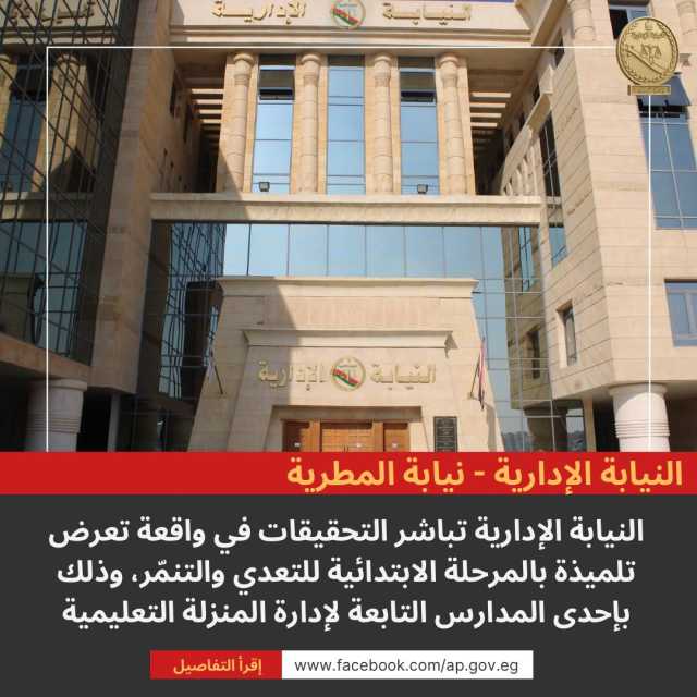 باشرت النيابة الإدارية بمركز المطرية محافظة الدقهلية، صباح اليوم الأربعاء، تحقيقاتها في واقعة تنمّر واعتداء لفظي وجسدي تعرضت له تلميذة بالصف الثاني الابتدائي، بإحدى مدارس إدارة المنزلة التعليمية