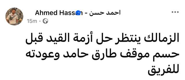 وكتب أحمد حسن عبر حسابه الشخصي بموقع فيسبوك: “الزمالك ينتظر حل أزمة القيد قبل حسم موقف طارق حامد وعودته للفريق”.
