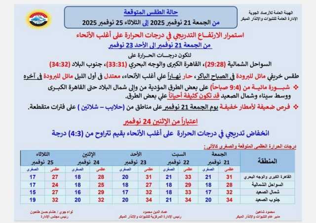 أعلنت هيئة الأرصاد الجوية درجات الحرارة والظواهر الجوية المتوقعة اعتباراً من الجمعة 21 نوفمبر حتى الثلاثاء 25 نوفمبر 2025.