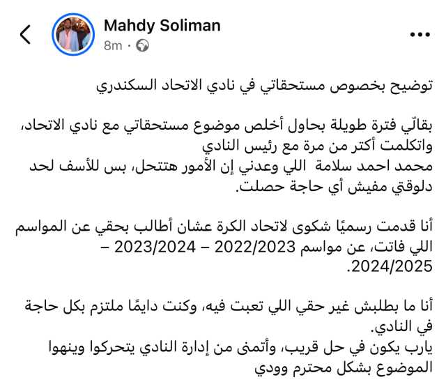 أزمة مهدي سليمان مع الاتحاد السكندريوكتب سليمان في منشور له عبر حسابه الشخصي بموقع فيسبوك: "توضيح بخصوص مستحقاتي في نادي الاتحاد السكندري، بقالّي فترة طويلة بحاول أخلص موضوع مستحقاتي مع نادي الاتحاد، واتكلمت أكتر من مرة مع رئيس النادي محمد احمد سلامة اللي وعدني إن الأمور هتتحل، بس للأسف لحد دلوقتي مفيش أي حاجة حصلت.