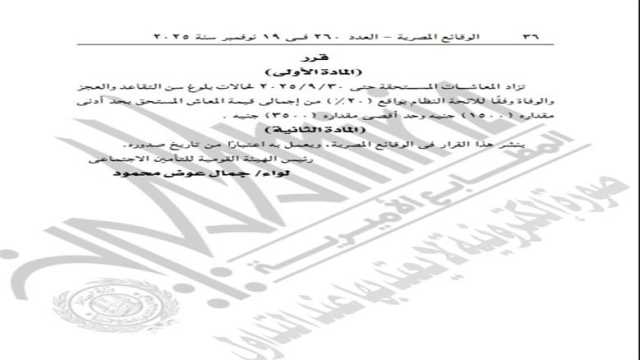 وأعلن القرار أن نسبة الزيادة الجديدة ستكون 20% من إجمالي قيمة المعاش المستحق، مع وضع حد أدنى للزيادة مقداره 1500 جنيه، وحد أقصى يصل إلى 3500 جنيه.