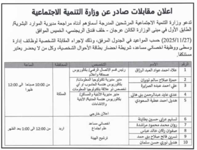 التنمية الاجتماعية تدعو مرشحين لإجراء المقابلات الشخصية