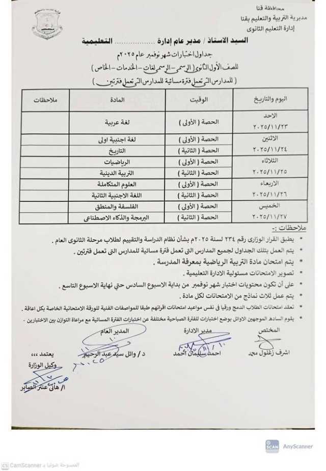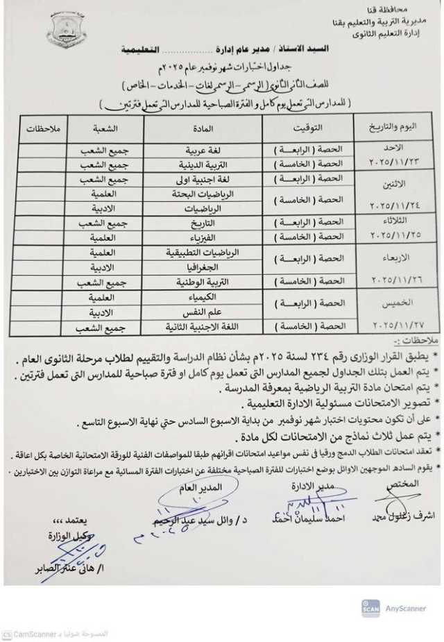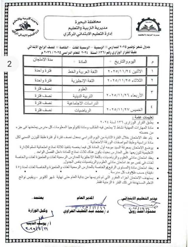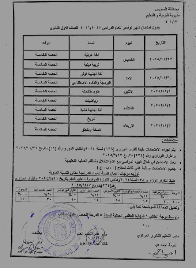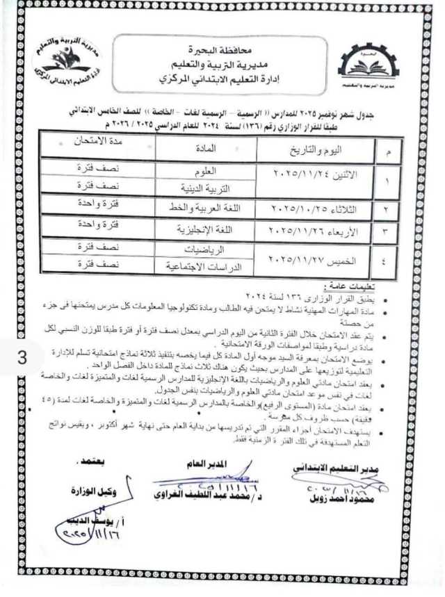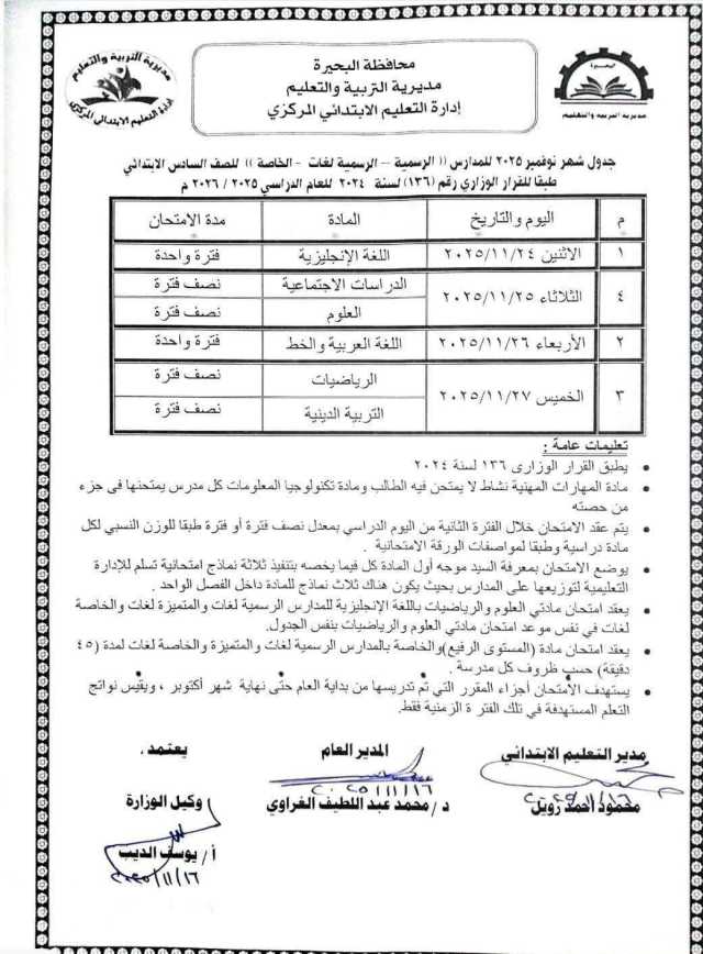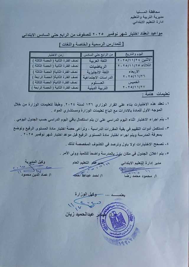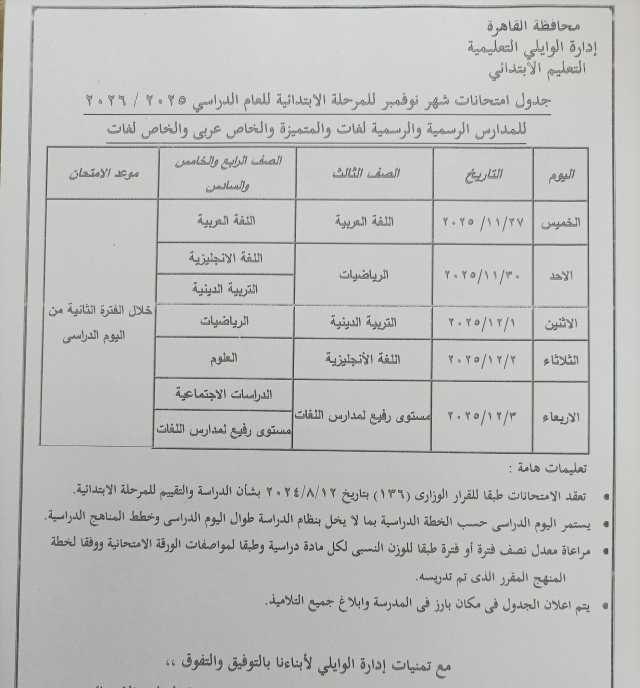 أكدت وزارة التربية والتعليم والتعليم الفني ، أنها لن تتولى وضع جدول امتحانات شهر نوفمبر 2025 بشكل مركزي موحد على مستوى الجمهورية ، مشيرةً إلى أن جدول امتحانات شهر نوفمبر 2025 تتولى وضعه وإعلانه المديريات والإدارات التعليمية والمدارس مع الإلتزام بالموعد الرسمي المحدد له .