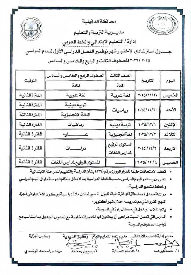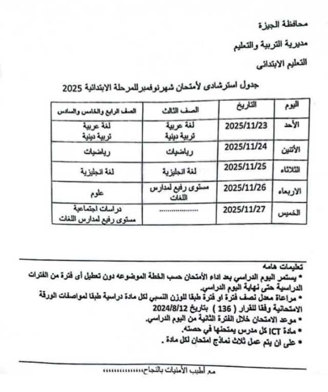 وتبدأ امتحانات شهر نوفمبر 2025 لطلاب صفوف النقل من 23 نوفمبر 2025 في محافظات (الجيزة ، وبني سويف، والمنيا ، وأسيوط ، وسوهاج ، وقنا ، والأقصر ، وأسوان ، والبحر الأحمر ، والوادى الجديد ، والفيوم ، والإسكندرية ، ومطروح ، والبحيرة )
