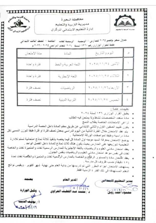 وسوف يؤدي التلاميذ الامتحان في حصة دراسية لكل صف دراسي خلال اليوم الدراسي ، وتحفظ أوراق الإجابة في كنترول المدرسة بعد الانتهاء من اعمال التصحيح ، كما سيتم الامتحان خلال اليوم الدراسي و يتم استكمال باقي اليوم الدراسي بشكل طبيعي، وسيتم تقييم الصفين الأول والثاني الابتدائي عن طريق معلم المادة .