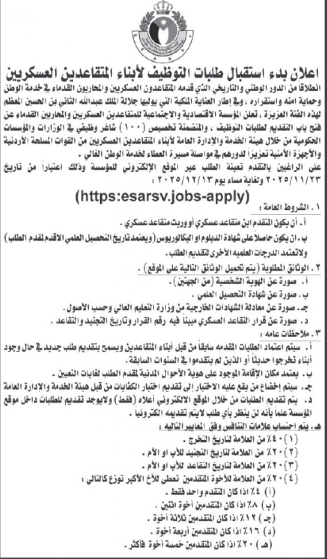 اعلنت المؤسسة الاقتصادية والاجتماعية للمتقاعدين العسكريين و #المحاربين_القدماء عن فتح باب التقديم لطلبات #التوظيف، والمتضمن تخصيص (100) #شاغر_وظيفي في الوزارات والمؤسسات الحكومية من خلال هيئة الخدمة والإدارة العامة، وذلك لأبناء #المتقاعدين_العسكريين من القوات المسلحة الأردنية والأجهزة الأمنية، تعزيزًا لدورهم في مواصلة مسيرة العطاء وخدمة الوطن الغالي.