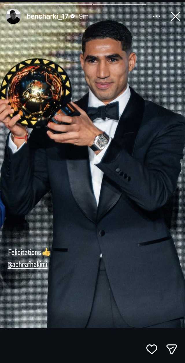 وشارك بن شرقي، تهنئة لأشرف حكيمي عبر حسابه على موقع التواصل الاجتماعي انستجرام.