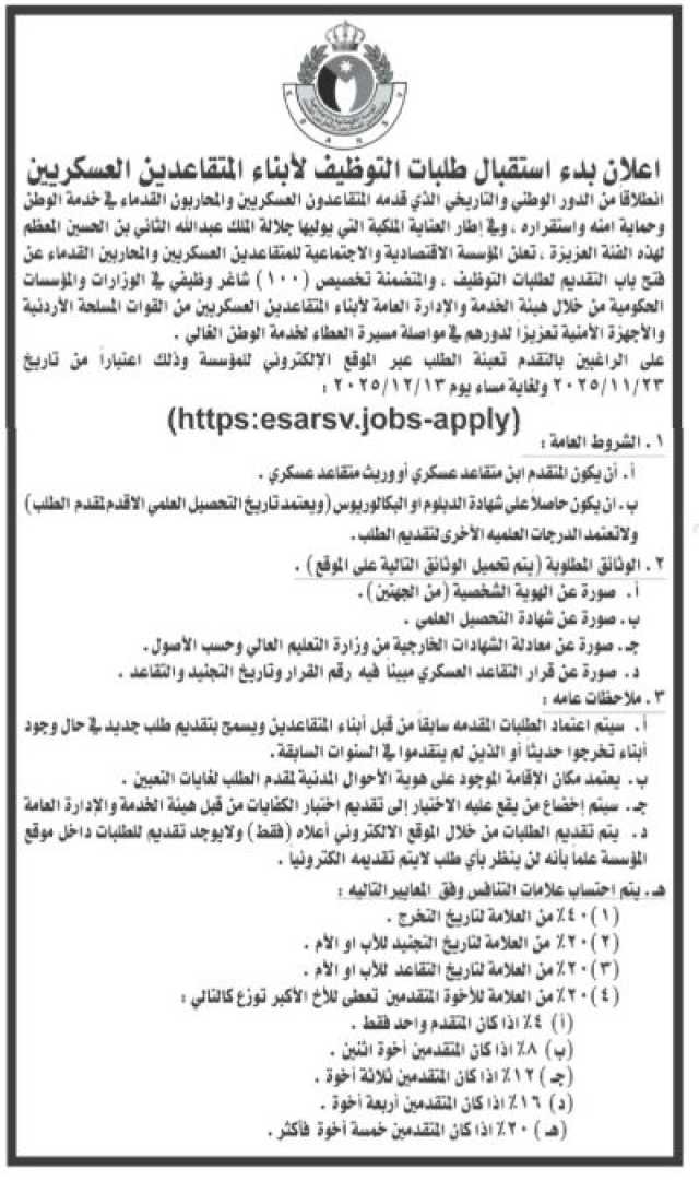 اعلنت المؤسسة الاقتصادية والاجتماعية للمتقاعدين العسكريين والمحاربين القدماء عن فتح باب التقديم لطلبات التوظيف، والمتضمن تخصيص (100) شاغر وظيفي في الوزارات والمؤسسات الحكومية من خلال هيئة الخدمة والإدارة العامة، وذلك لأبناء المتقاعدين العسكريين من القوات المسلحة الأردنية والأجهزة الأمنية، تعزيزًا لدورهم في مواصلة مسيرة العطاء وخدمة الوطن الغالي.