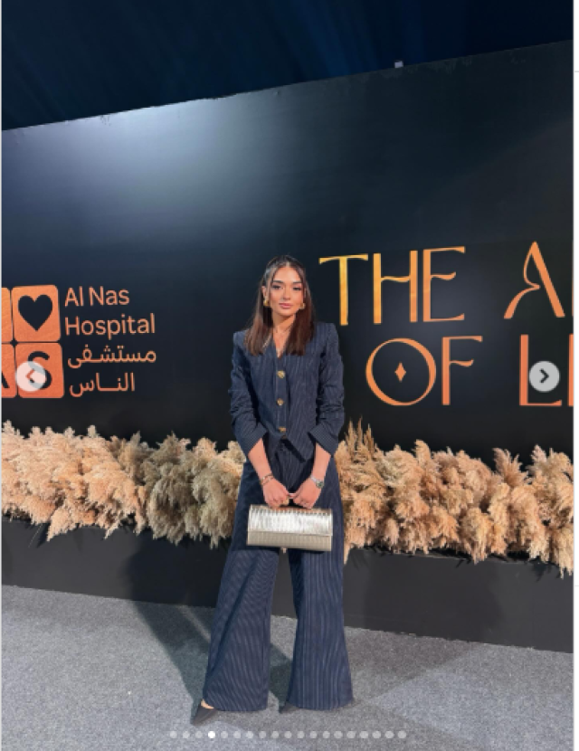 View this post on Instagramأكملت الإطلالة بتسريحة شعر نصفية ومكياج يرتكز على الماسكارا الكثيفة وأحمر الشفاه الوردي.