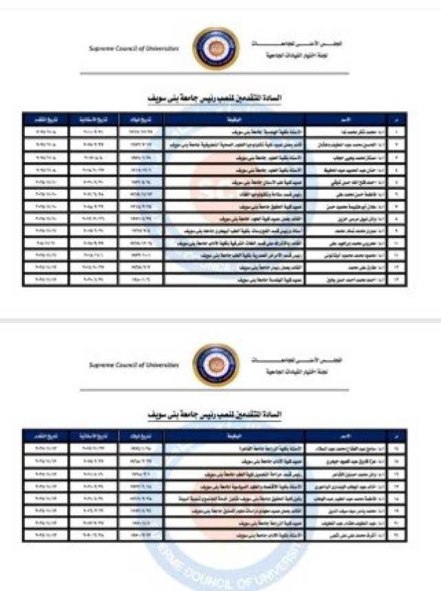 أعلنت لجنة اختيار القيادات الجامعية بالمجلس الأعلى للجامعات القائمة النهائية للمتقدمين لشغل منصب رئيس جامعة بني سويف، خلفًا للدكتور منصور حسن لبلوغه السن القانونية، بعد غلق باب التقدم واعتماد الملفات رسميا وضمت القائمة 21 مرشحا من مختلف كليات الجامعة، إضافة إلى مرشحين من جامعات أخرى.
