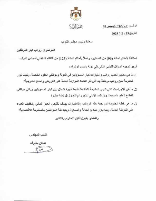 وجّه النائب المهندس #عدنان_مشوقة سؤالا نيابيا إلى رئيس الوزراء الدكتور #جعفر_حسان حول #امتيازات و #رواتب #كبار_الموظفين_الحكوميين.