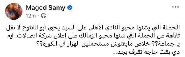 وكتب سامي على حسابه الشخصي بموقع فيسبوك: “الحملة التي يشنها محبو النادي الأهلي على السيد يحيى أبو الفتوح لا تقل تفاهة عن الحملة التي شنها محبو الزمالك على إعلان شركة اتصالات”، متسائلًا عن سبب عدم تقبّل البعض لأي مداعبات تخص كرة القدم، مضيفًا: “إيه يا جماعة؟ خلاص مبقتوش مستحملين الهزار في الكورة؟ دي بقت حاجة تقرف بجد”