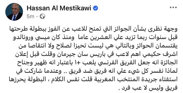 وقال المستكاوي في منشور عبر حسابه على موقع التواصل الاجتماعي فيسبوك: “إن رأيه “ليس تحيزًا لمحمد صلاح ولا انتقاصًا من أشرف حكيمي، أهم لاعب في باريس سان جيرمان”، موضحًا أنه سبق وأكد قبل إعلان الجائزة أن حكيمي جعل فريقه “يلعب +1” بفضل أدائه كظهير وجناح في الوقت ذاته”.