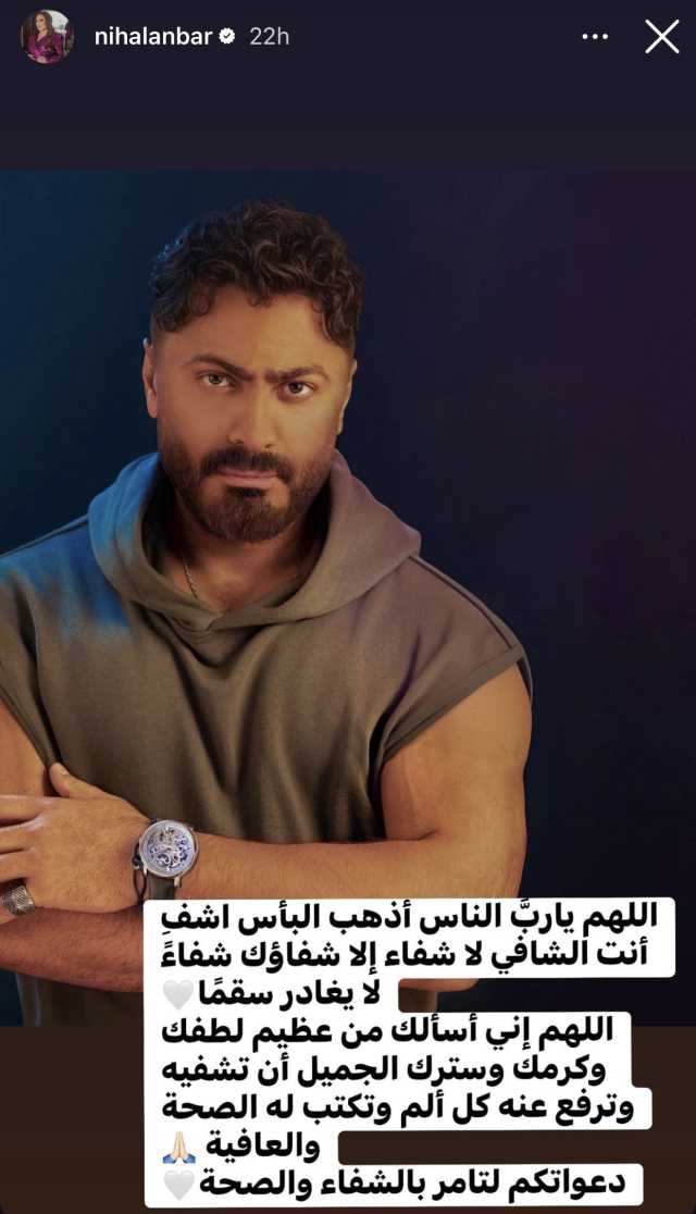 وكتبت عنبر على حسابها الشخصي بموقع إنستجرام: "اللهم ياربّ الناس أذهب البأس اشفِ أنت الشافي لا شفاء إلا شفاؤك شفاءً لا يغادر سقمًا، اللهم إني أسألك من عظيم لطفك وكرمك وسترك الجميل أن تشفيه وترفع عنه كل ألم وتكتب له الصحة والعافية، دعواتكم لتامر بالشفاء والصحة".