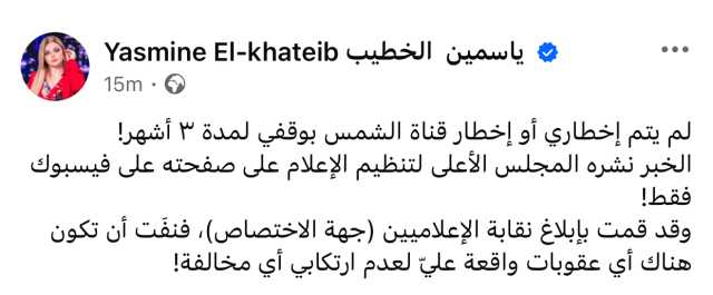 وقالت الخطيب في منشور لها عبر حسابها الشخصي بموقع فيسبوك: “لم يتم إخطاري أو إخطار قناة الشمس بوقفي لمدة ٣ أشهر! الخبر نشره المجلس الأعلى لتنظيم الإعلام على صفحته على فيسبوك فقط وقد قمت بإبلاغ نقابة الإعلاميين جهة الاختصاص، فنفَت أن تكون هناك أي عقوبات واقعة عليّ لعدم ارتكابي أي مخالفة”.