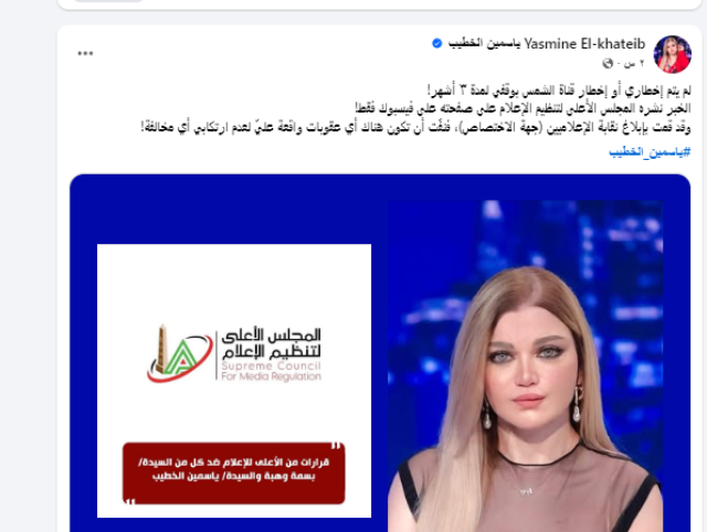 وقالت الخطيب في منشور لها عبر حسابها الشخصي بموقع فيسبوك: “لم يتم إخطاري أو إخطار قناة الشمس بوقفي لمدة ٣ أشهر! الخبر نشره المجلس الأعلى لتنظيم الإعلام على صفحته على فيسبوك فقط وقد قمت بإبلاغ نقابة الإعلاميين جهة الاختصاص، فنفَت أن تكون هناك أي عقوبات واقعة عليّ لعدم ارتكابي أي مخالفة”.