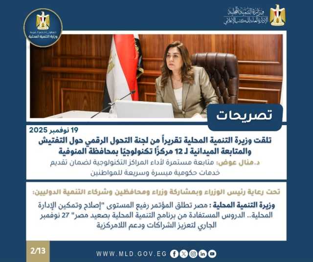 تلقت الدكتورة منال عوض وزيرة التنمية المحلية ، تقريرًا من لجنة التحول الرقمي بالوزارة للتفتيش والمتابعة الميدانية لـ 12 مركزًا تكنولوجيًا بمحافظة المنوفية، شملت مراكز ومدن وأحياء ( شبين الكوم - حى غرب شبين - شرق شبين - بركة السبع -قويسنا - الباجور - سرس الليان - منوف - الشهداء - تلا- السادات - أشمون)، وذلك في إطار جهود الوزارة للمتابعة الدورية ورفع كفاءة الأداء داخل المراكز التكنولوجية على مستوى الجمهورية.