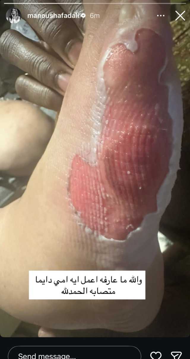 كشفت الفنانة منة فضالي، عن إصابة والدتها في القدم بجرح كبير، عبر حسابها الشخصي على موقع التواصل الاجتماعي انستجرام.