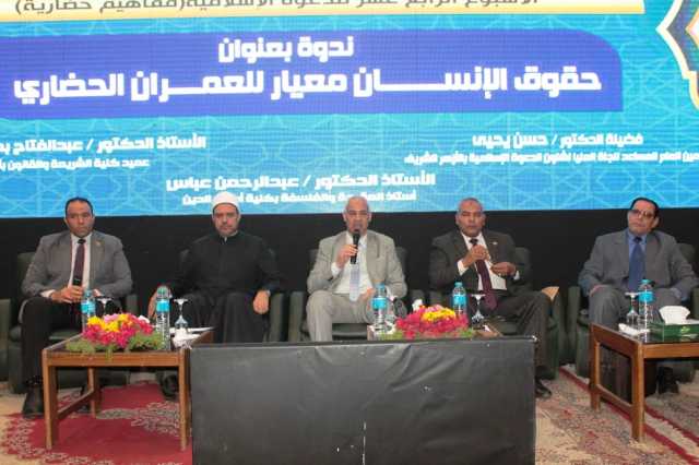 وتضمن ختام الأسبوع ندوة بعنوان "حقوق الإنسان.. معيار للعمران الحضاري"، تناولت العلاقة الوثيقة بين منظومة القيم وبناء المجتمع، وأهمية الحرية المنضبطة بوصفها ركيزة من ركائز الاستقرار والنهضة.