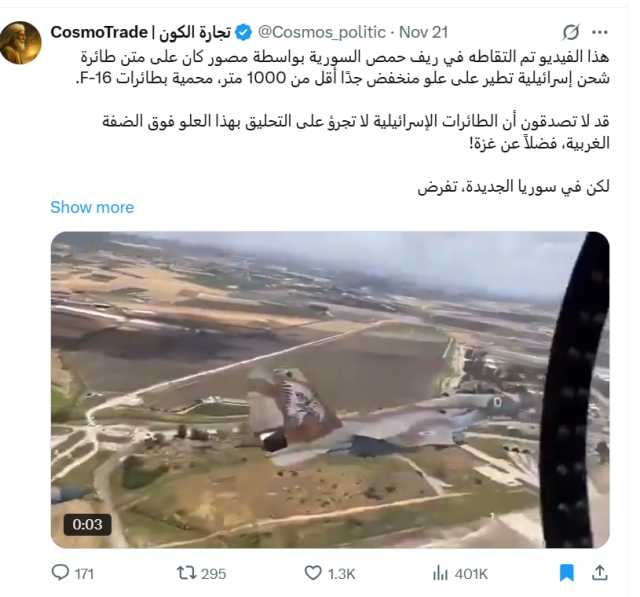 كما ذهبت تعليقات أخرى إلى إعطاء سياقات مٌضللة تقول: "هذا الفيديو تم التقاطه في ريف حمص السورية بواسطة مصور كان على متن طائرة شحن إسرائيلية تطير على علو منخفض جدًا أقل من 1000 متر، محمية بطائرات F-16... في سوريا الجديدة، تفرض إسرائيل تفوقًا جويًا وسيطرة كاملة على الأجواء... الرسالة موجهة إلى تركيا وليس إلى سوريا".
