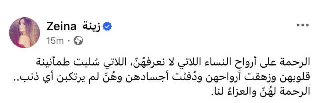 وعلقت زينة على الفيديو التي نشرته على حسابها الشخصي بموقع فيسبوك قائلة: "الرحمة على أرواح النساء اللاتي لا نعرفهن، اللاتي سُلِبَت طمأنينة قلوبهن وزُهِقَت أرواحهن، ودُفِنَت أجسادهن وهن لم يرتكبن أي ذنب، الرحمة لهن والعزاء لنا".