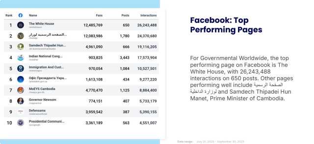 وجاءت صفحة وزارة الداخلية المصرية مباشرة بعد صفحة البيت الأبيض الأمريكي التي حافظت على صدارتها العالمية من حيث حجم التفاعل وانتشار المحتوى، بينما تفوقت الصفحة المصرية على عدد من الصفحات الحكومية البارزة مثل صفحة رئيس وزراء كمبودي وصفحة المؤتمر الوطني الهند وصفحة وكالة إنفاذ قوانين الهجرة والجمارك الأمريكية