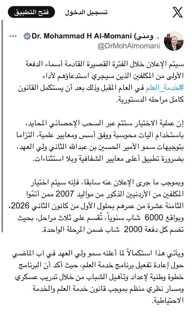 وأوضح أن المكلفين سيتم اختيارهم من الأردنيين الذكور من مواليد 2007، ممن أتمّوا الثامنة عشرة من عمرهم بحلول الأول من كانون الثاني 2026، بواقع 6000 شاب سنويًا تُقسم على ثلاث مراحل، بحيث تضم كل دفعة 2000 شاب ضمن المرحلة الواحدة.