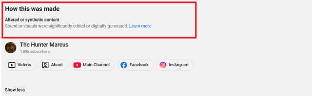 وفي أدنى وصف الفيديو موضع التحليل، المنشور في قناة أخرى مرتبطة بنفس الحسابات، اسمها "Marcus - The Gold Chaser"، وضع موقع يوتيوب إشارة إلى أنه "محتوى مُعدّل أو مُركّب.. تم تعديل الصوت أو اللقطات بشكل كبير أو تم إنشاؤها رقميًا". وهو ما يعني أن الفيديو ليس حقيقيًا.