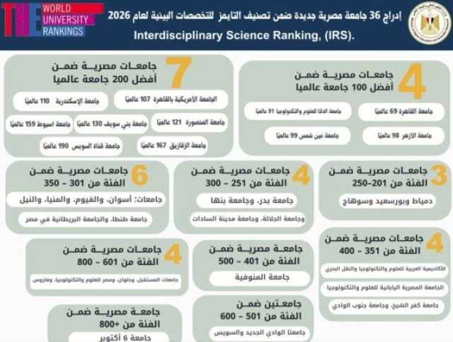 أعلن تصنيف التايمز للتخصصات البينية نتائجه لعام 2026، والتي أظهرت إدراج 36 جامعة مصرية، مقارنة بإدراج 27 جامعة في نتائج هذا التصنيف والذي بدأته مؤسسة Times Higher Education لأول مرة العام الماضي 2025، تحت اسم Interdisciplinary Science Ranking، (IRS).
