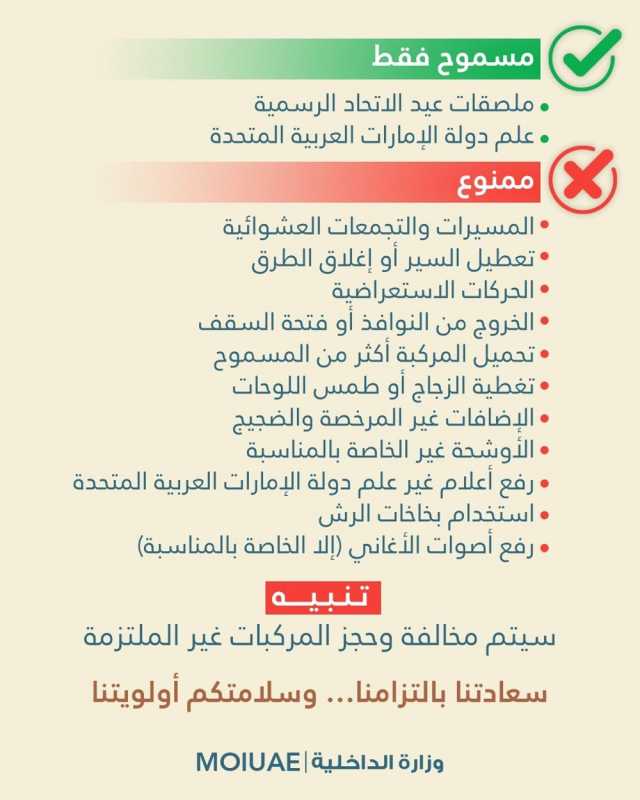 وزارة الداخلية تعلن الاشتراطات والضوابط القانونية للاحتفال وتزيين المركبات خلال احتفالات الدولة بعيد الاتحاد الـ 54 ????????
