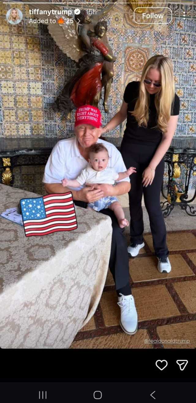 نشرت تيفاني إبنة الرئيس الأميركيّ دونالد ترامب، صوراً عبر خاصية "ستوري" عبر حسابها على "انستغرام"، لوالدها وهو يحمل حفيده ألكسندر. وعلّقت تيفاني على صور إبنها وأبيها بالقول: "الجدّ وألكسندر، العمل بجهدٍ". وتجدر الإشارة إلى أنّ تيفاني متزوّجة من اللبناني مايكل بولس، نجل رجل الأعمال مسعد بولس.