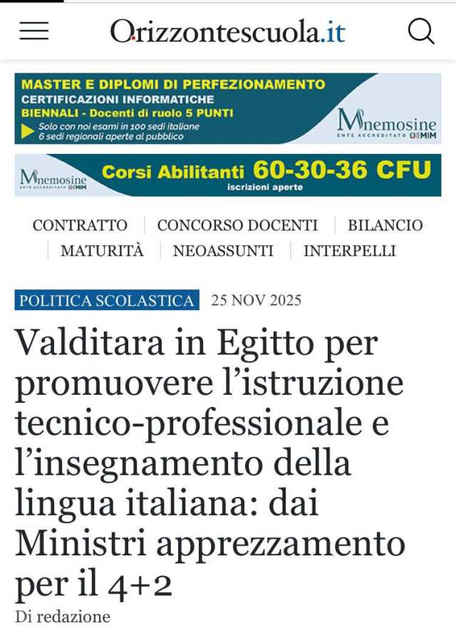كما ناقش الموقع المتخصص Orizzontescuola التحول من مرحلة “الحديث والتخطيط” إلى التنفيذ الفعلي داخل المدارس، حيث أبرز الموقع ربط المدارس المصرية بخبرات مباشرة من أكاديميات إيطالية، وتدريب المعلمين وتطوير المناهج.