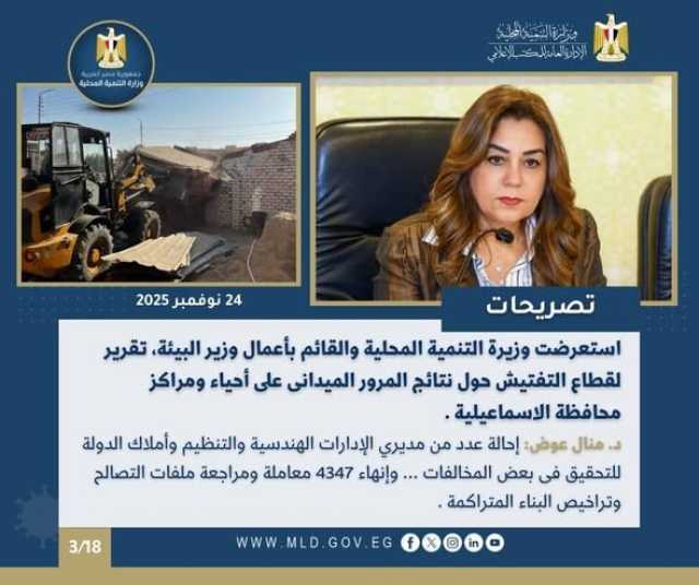 كما استعراضت الدكتورة منال عوض وزيرة التنمية المحلية والقائم بأعمال وزيرة البيئة، تقريراً شاملًا من قطاع التفتيش والمتابعة بالوزارة برئاسة المهندس هيثم الدسوقى حول نتائج المأمورية الميدانية المخططة التي تم تنفيذها خلال شهر نوفمبر الجاري على عدد من المدن والمراكز والأحياء بمحافظة الإسماعيلية، حيث تم متابعة منظومة العمل داخل المراكز التكنولوجي والإدارات الهندسية ومختلف إدارات الأحياء والمراكز والمدن، إلى جانب المرور الميداني لمتابعة حالة الانضباط بالشارع.