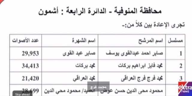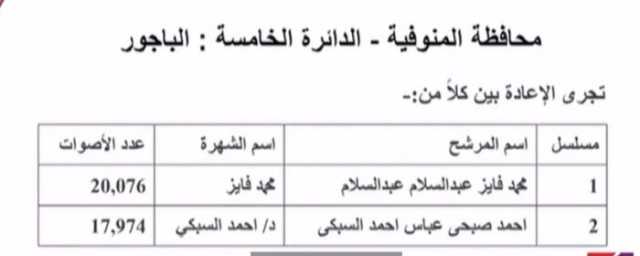 وجاءت نتائج فرز أصوات المرحلة الثانية لانتخابات مجلس النواب 2025 بمحافظة المنوفية كما يلي: