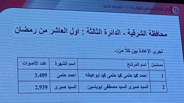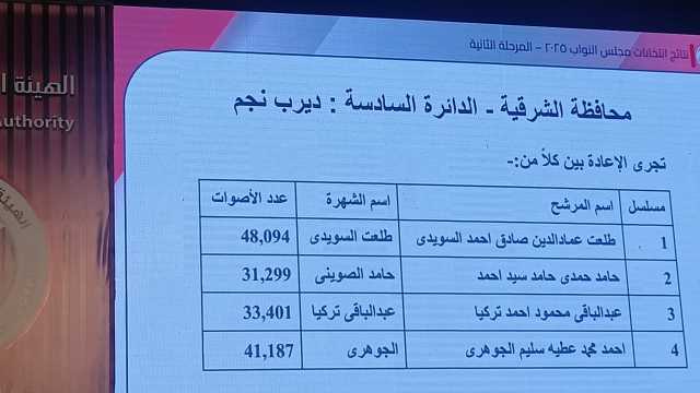وكشفت الهيئة عن نتائج الدوائر بمحافظة الشرقية، إلى جانب توضيح ما تبقى من خطوات المرحلة الانتخابية المقبلة.