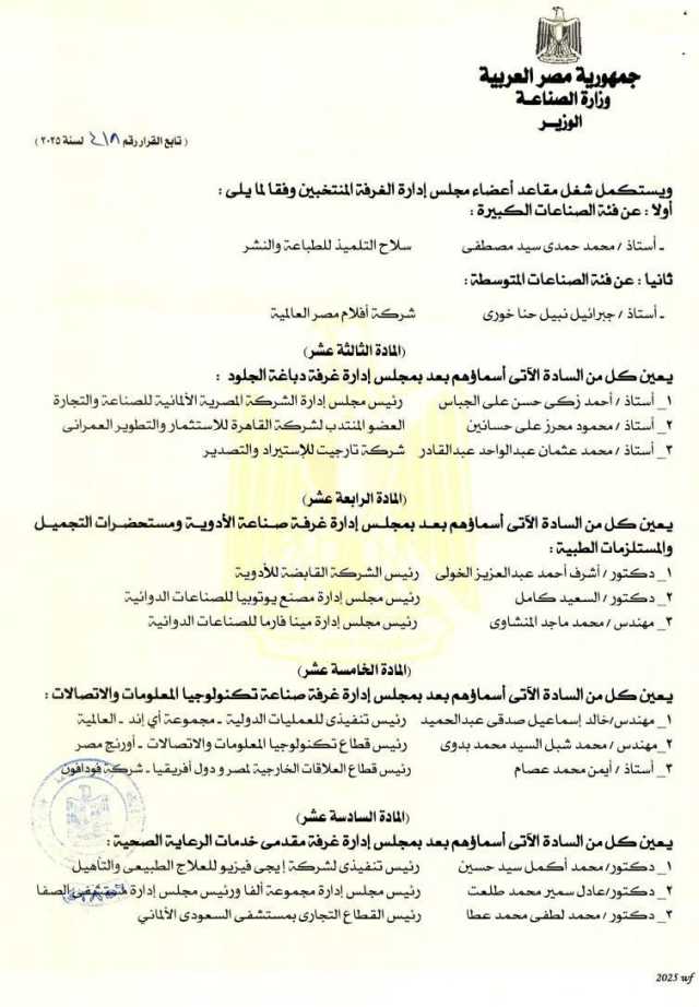 أصدر الفريق كامل الوزير نائب رئيس الوزراء للتنمية الصناعية وزير الصناعة والنقل، قرارًا بتعيين عدد من رجال الأعمال والخبراء في عضوية الغرف الصناعية باتحاد الصناعات.