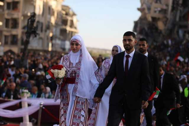 وضم الحفل 54 عريسا وعروسا نظمتها الإمارات ضمن عملية "الفارس الشهم 3" بين أنقاض المباني المدمرة في مدينة حمد السكنية غربي خان يونس جنوبي غزة، بحسب وكالة أنباء الأناضول.