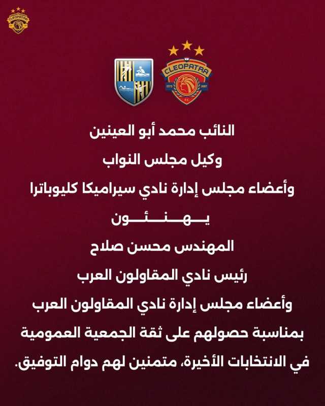 تقدم النائب محمد أبو العينين، وأعضاء مجلس إدارة نادي سيراميكا كليوباترا ، بالتهنئة للمهندس محسن صلاح رئيس نادي المقاولون العرب وأعضاء مجلس إدارة نادي المقاولون العرب بمناسبة حصولهم على ثقة الجمعية العمومية في الانتخابات الأخيرة .