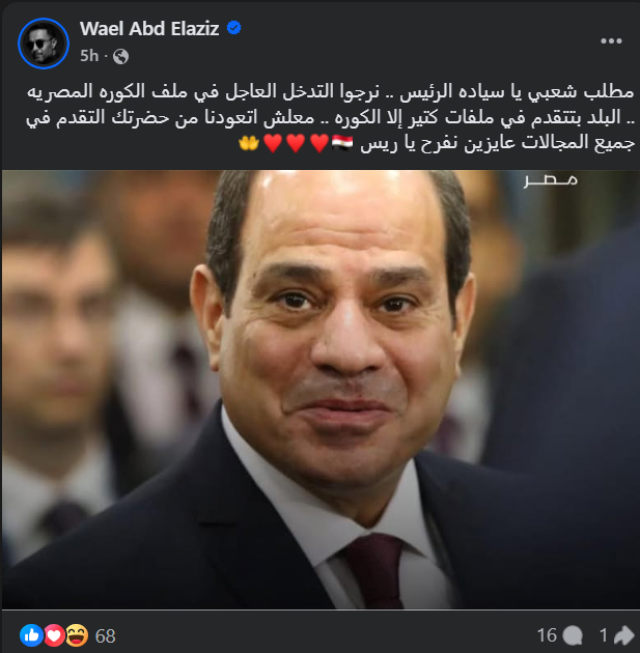 كتب وائل عبد العزيز عبر حسابه الشخصي بموقع التواصل الإجتماعي الأشهر “فيس بوك”: “مطلب شعبي يا سياده الرئيس .. نرجوا التدخل العاجل في ملف الكره المصريه”.