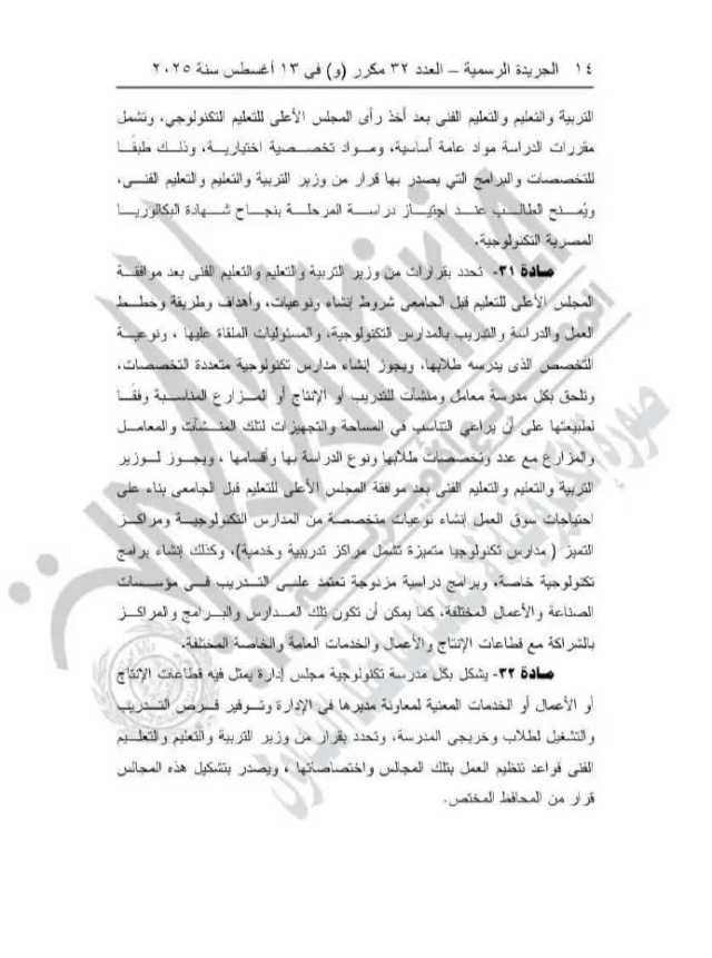 تشمل مقررات الدراسة مواد عامة أساسية، ومواد تخصصية اختيارية، وذلك طبقا للتخصصات والبرامج التي يصدر بها قرار من وزير التربية والتعليم والتعليم الفني، ويُمنح الطالب عند اجتياز دراسة المرحلة بنجاح شهادة البكالوريا المصرية التكنولوجية.تحدد بقرارات من وزير التربية والتعليم والتعليم الفني بعد موافقة المجلس الأعلى للتعليم قبل الجامعي شروط إنشاء ونوعيات، وأهداف وطريقة وخطط العمل والدراسة والتدريب بالمدارس التكنولوجية، والمسئوليات الملقاة عليها، ونوعية التخصص الذي يدرسه طلابها. يجوز إنشاء مدارس تكنولوجية متعددة التخصصات، وتلحق بكل مدرسة معامل ومنشآت للتدريب أو الإنتاج أو المزارع المناسبة وفقا لطبيعتها على أن يراعى التناسب في المساحة والتجهيزات لتلك المنشآت والمعامل والمزارع مع عدد وتخصصات طلابها ونوع الدراسة بها وأقسامها.يجوز لوزير التربية والتعليم والتعليم الفني بعد موافقة المجلس الأعلى للتعليم قبل الجامعي بناء على احتياجات سوق العمل إنشاء نوعيات متخصصة من المدارس التكنولوجية ومراكز التميز (مدارس تكنولوجيا متميزة تشمل مراكز تدريبية وخدمية)، وكذلك إنشاء برامج تكنولوجية خاصة، وبرامج دراسية مزدوجة تعتمد على التدريب في مؤسسات الصناعة والأعمال المختلفة، كما يمكن أن تكون تلك المدارس والبرامج والمراكز بالشراكة مع قطاعات الإنتاج والأعمال والخدمات العامة والخاصة المختلفة.يُشكَّل بكل مدرسة تكنولوجية مجلس إدارة يمثل فيه قطاعات الإنتاج أو الخدمات المعنية لمعاونة مديرها في الإدارة وتوفير فرص التدريب والتشغيل لطلاب وخريجي المدرسة، وتحدد بقرار من وزير التربية والتعليم والتعليم الفني قواعد تنظيم العمل بتلك المجالس واختصاصاتها، ويصدر بتشكيل هذه المجالس قرار من المحافظ المختص.يهدف التعليم التكنولوجي المتقدم إلى إعداد فئة "فني أول" في المجالات المختلفة. ويتم القبول في برامج التعليم التكنولوجي المتقدم من الحاصلين على شهادة إتمام الدراسة بمرحلة التعليم الأساسي وفقاً للشروط والضوابط التي يصدر بها قرار من الوزيرين المختصين بالتعليم الفني والتعليم العالي بعد موافقة المجلس الأعلى للجامعات والمجلس الأعلى للتعليم التكنولوجي، ويجوز أن يتضمن القرار المشار إليه النظام الداخلي في بعض أو كل هذه البرامج مع تحديد مقابل الإقامة والغذاء وقواعد الإعفاء منه.يُمنَح الطالب عند اجتياز دراسة برامج التعليم التكنولوجي المتقدم بنجاح شهادة دبلوم التعليم التكنولوجي المتقدم نظام الخمس سنوات ويُحدِّد فيها نوع التخصص.