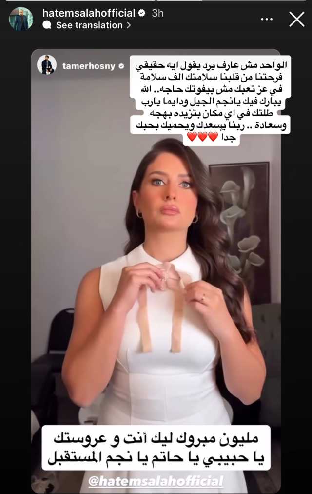 حرص الفنان تامر حسني على تهنئة الفنان حاتم صلاح بمناسبة زواجه، وقام بنشر ستوري تهنئة عبر حسابه الشخصي بموقع إنستجرام كتب فيها: “مليون مبروك ليك أنت و عروستك يا حبيبي يا حاتم يا نجم المستقبل”.