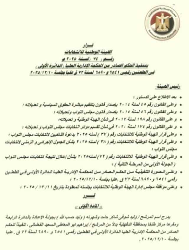 أصدرت الهيئة الوطنية للانتخابات برئاسة القاضي حازم بدوى القرار رقم 74 لسنة 2025 بتنفيذ الحكم الصادر من المحكمة الإدارية العليا، الدائرة الأولى في الطعنين رقمى 6541 و 6890 لسنة 72 ق عليا بإدراج المرشح/ وليد شوقي شاكر حامد وشهرته «وليد حسب الله» بجولة الإعادة بالدائرة الرابعة ومقرها مركز طلخا بمحافظة الدقهلية بدلا من المرشح/ إبراهيم أبو المعاطى السيد الفضالى.