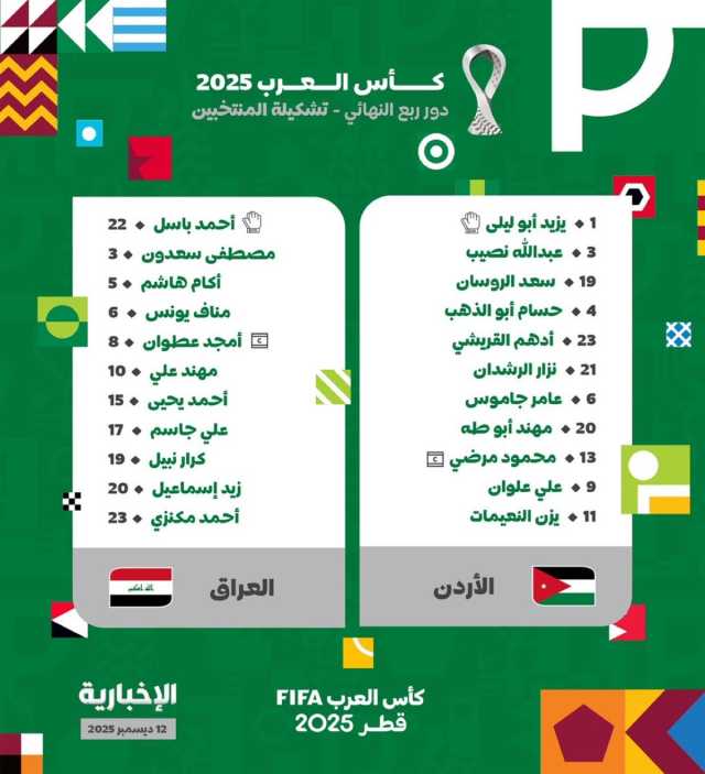 أعلنت الأجهزة الفنية لمنتخبي العراق والأردن عن التشكيلة الرسمية التي سيدخلون بها مباراة اليوم المرتقبة في إطار منافسات الدور ربع النهائي من بطولة كأس العرب 2025.