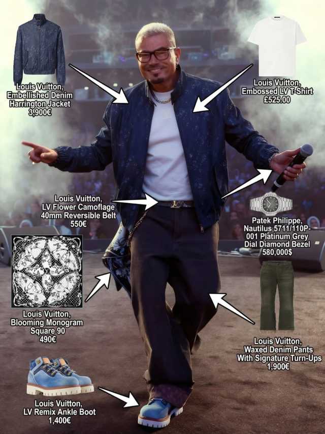 وارتدى عمرو دياب في الحفل، تيشيرت أبيض ماركة «لويس فويتون» وسعره 525 يورو، وفوقه جاكيت من نفس الماركة وسعره 3900 يورو، والحزام سعره 550 يورو، والشال سعره 490 يورو، أما البنطال الجينز فجاء سعره 1900 يورو، والحذاء 1400 يورو.