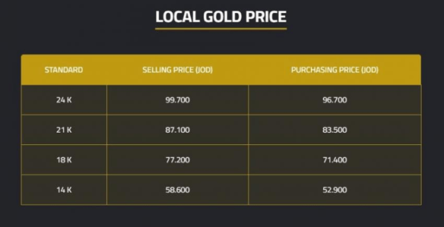 كما بلغ سعر الغرام الواحد من الذهب عيارات 24 و18 و14 لغايات البيع من محالّ الصاغة 99.